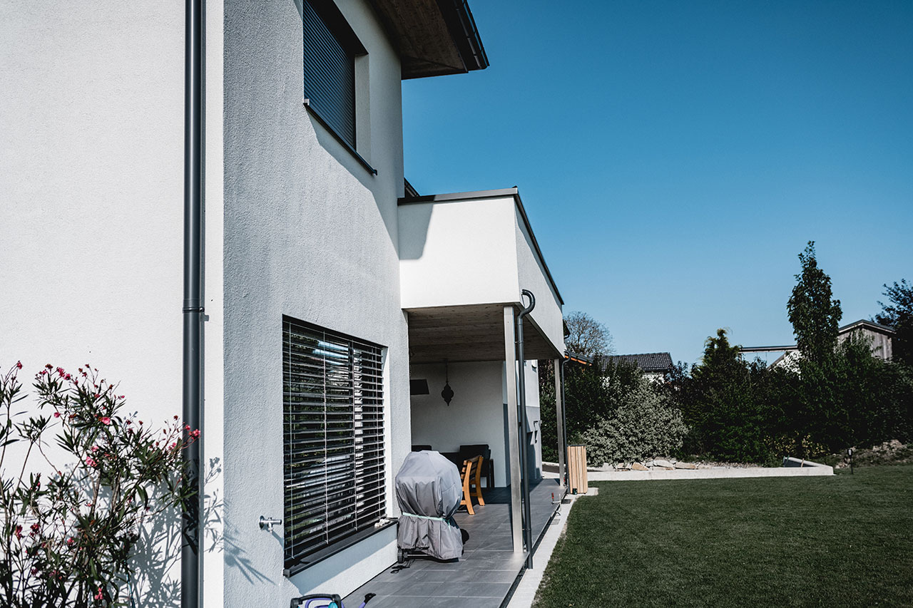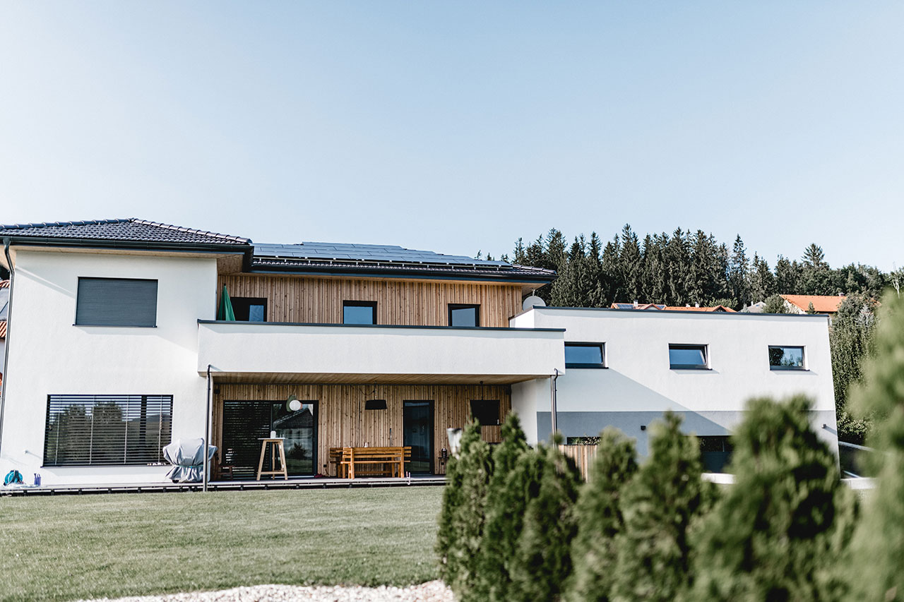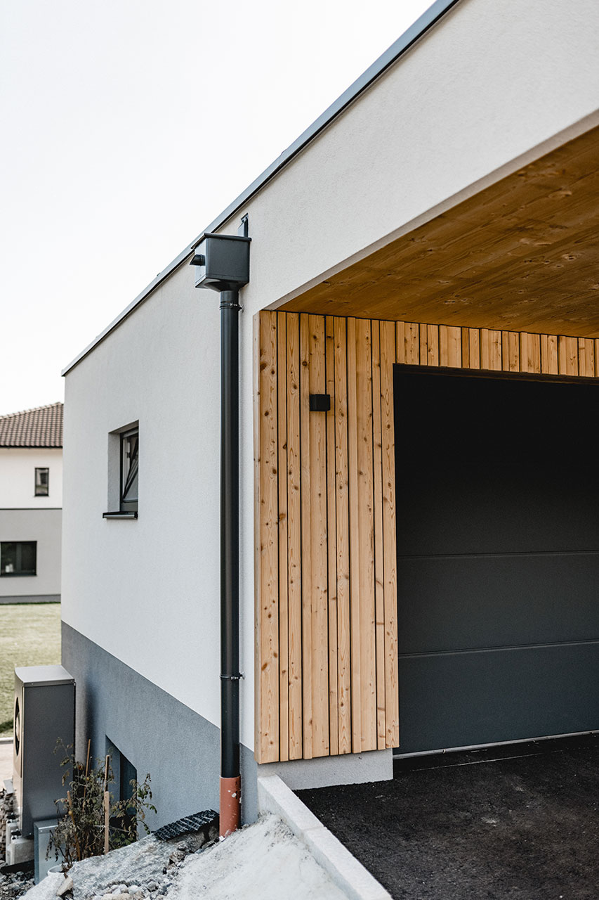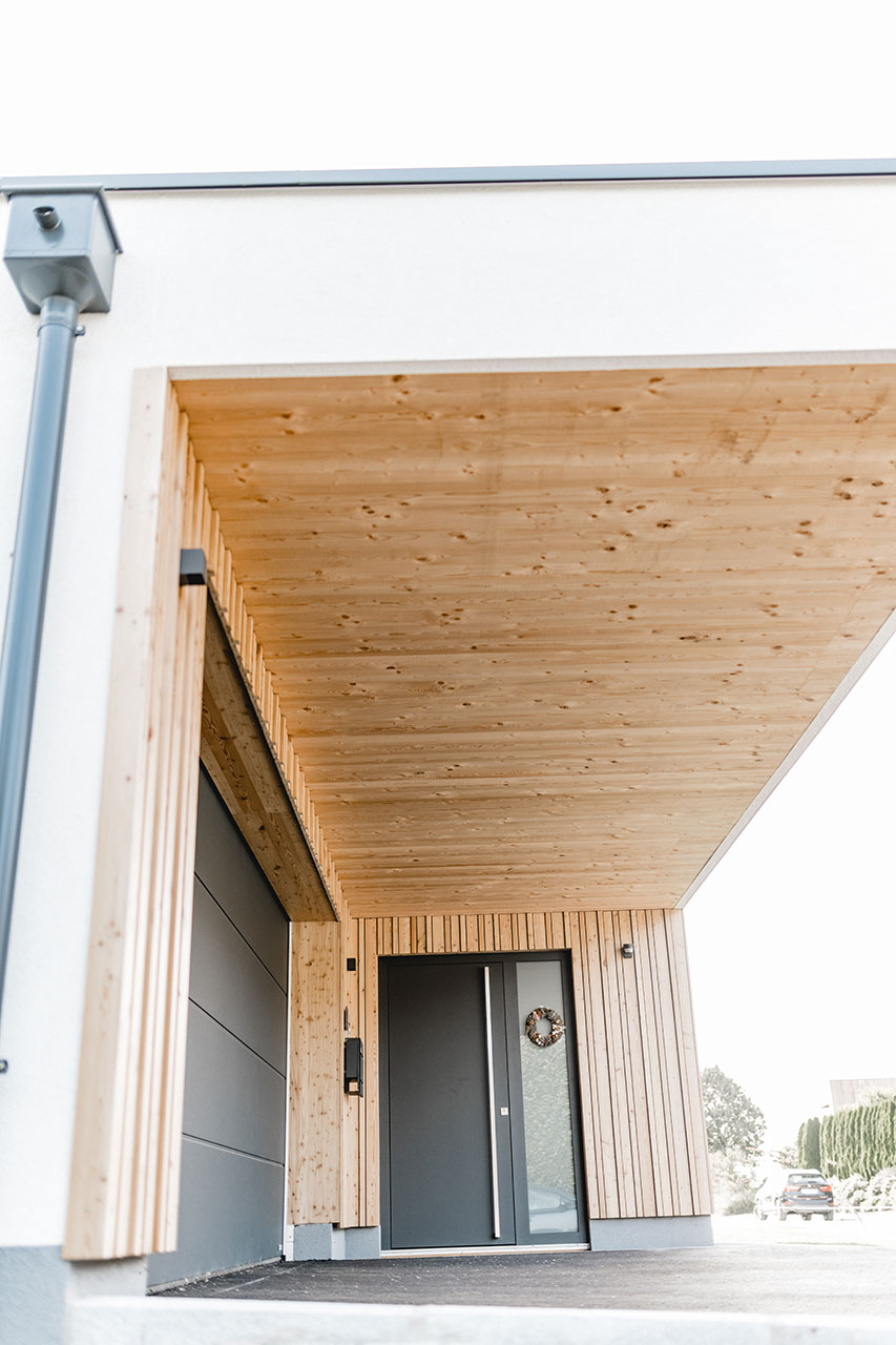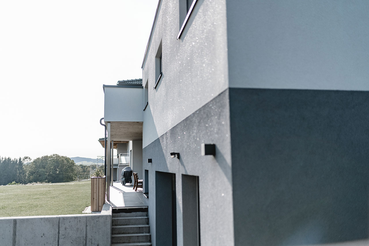 Bau: Winter 2018/Sommer 2019 Fassade: verschiedene Holzstrukturen Eyecatcher: Holzfassade vereint mit Putz (Glitzer)